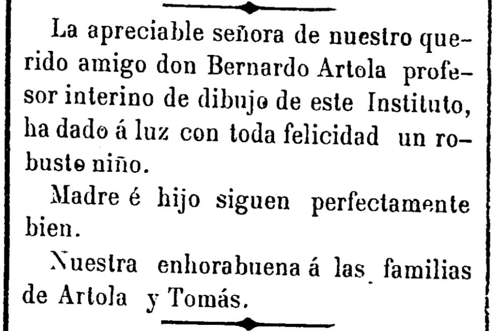 A las dos de la tarde del martes 20 de diciembre de 1904 nace, en la casa familiar de la calle Caballeros, el tercer hijo del matrimonio compuesto por Bernardo Artola Soligó y Carmen Tomás Traver. El recién nacido es inscrito con los nombres de Bernardo, Manuel, Francisco y Vicente, y bautizado el día 26 de diciembre en la Arciprestal de Santa María, tal y como recogerá en este blog su propio hijo, Bernardo Artola Castellets.