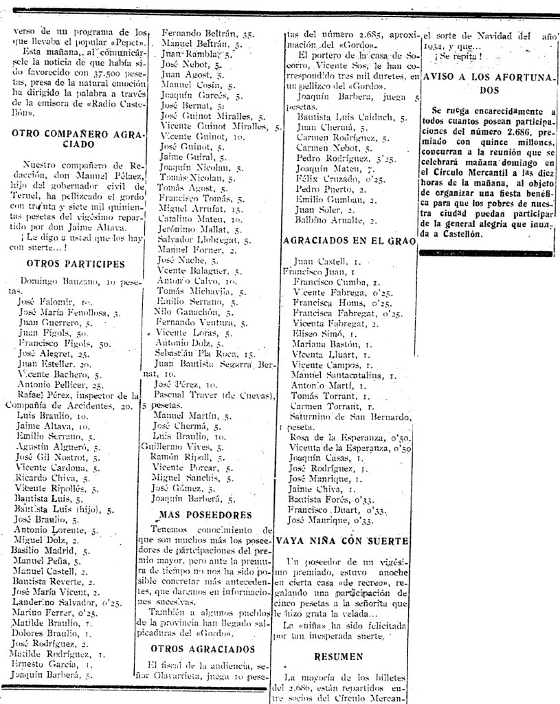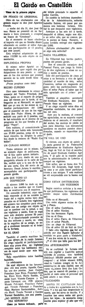 «Repartidísimo» llega en 1934 el popular premio Gordo del Sorteo de Navidad a la provincia de Castellón, según relata Diario de Castellón el domingo 23 de diciembre. Con una pormenorizada crónica de la noticia, se cuentan «salpicaduras respetables» de la suerte en el Grao, Vila-real, la Vall d’Uixó y Vistabella. La suerte sonríe con 15.100.000 pesetas de la época a la provincia, y son incontables las anécdotas de los afortunados del día que se recogen en la prensa. La culpa, del número 2.686, repartido entre Castellón y Santander. Se da la circunstancia de que el regente de la administración de la calle Enmedio -entonces González Chermá-, Juan Carrión González, ha recogido pocas horas antes del sorteo los vigésimos -que no décimos- aún no vendidos de este número, por valor de unas 8.000 pesetas, y ha salido a la busca de clientes.