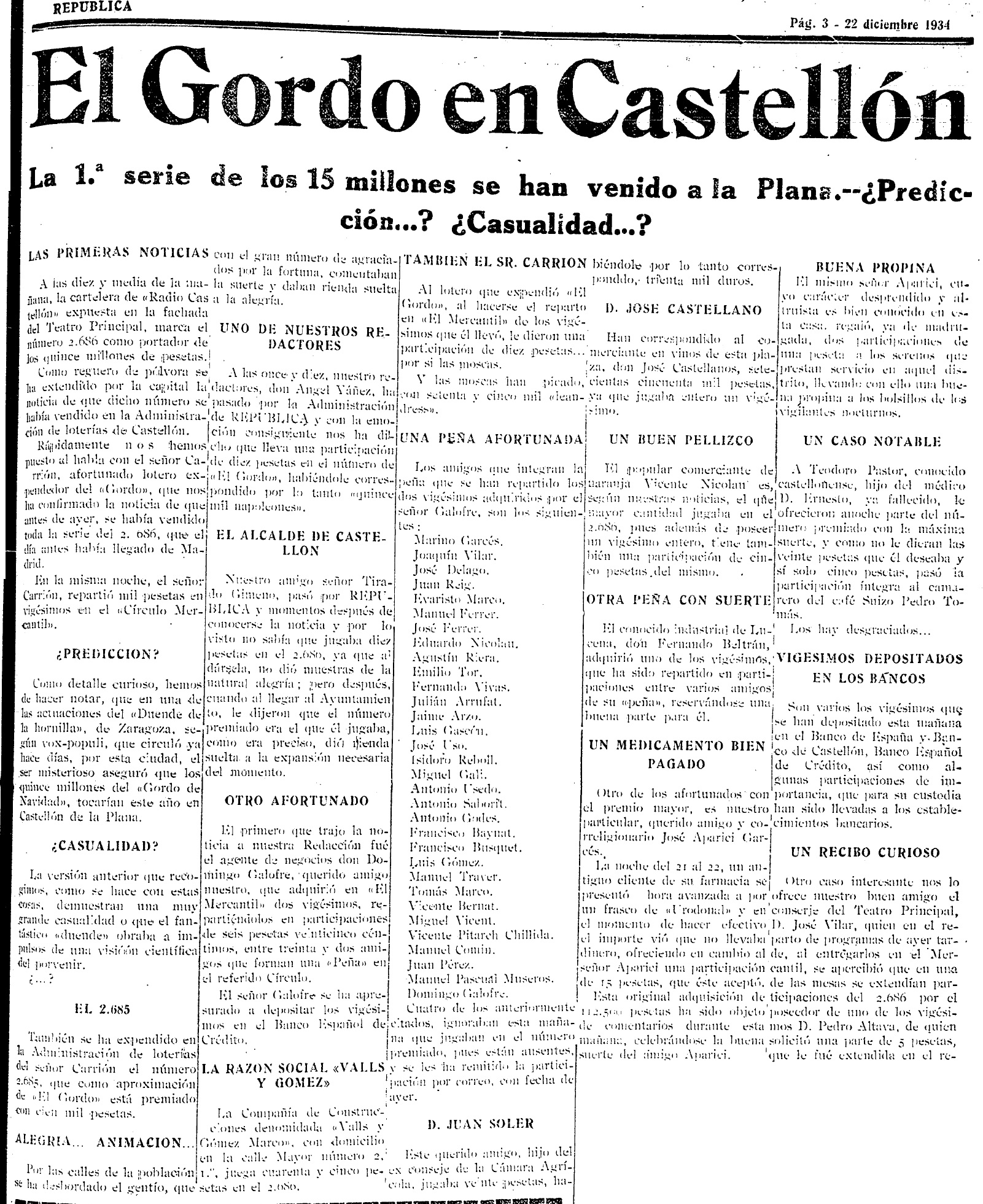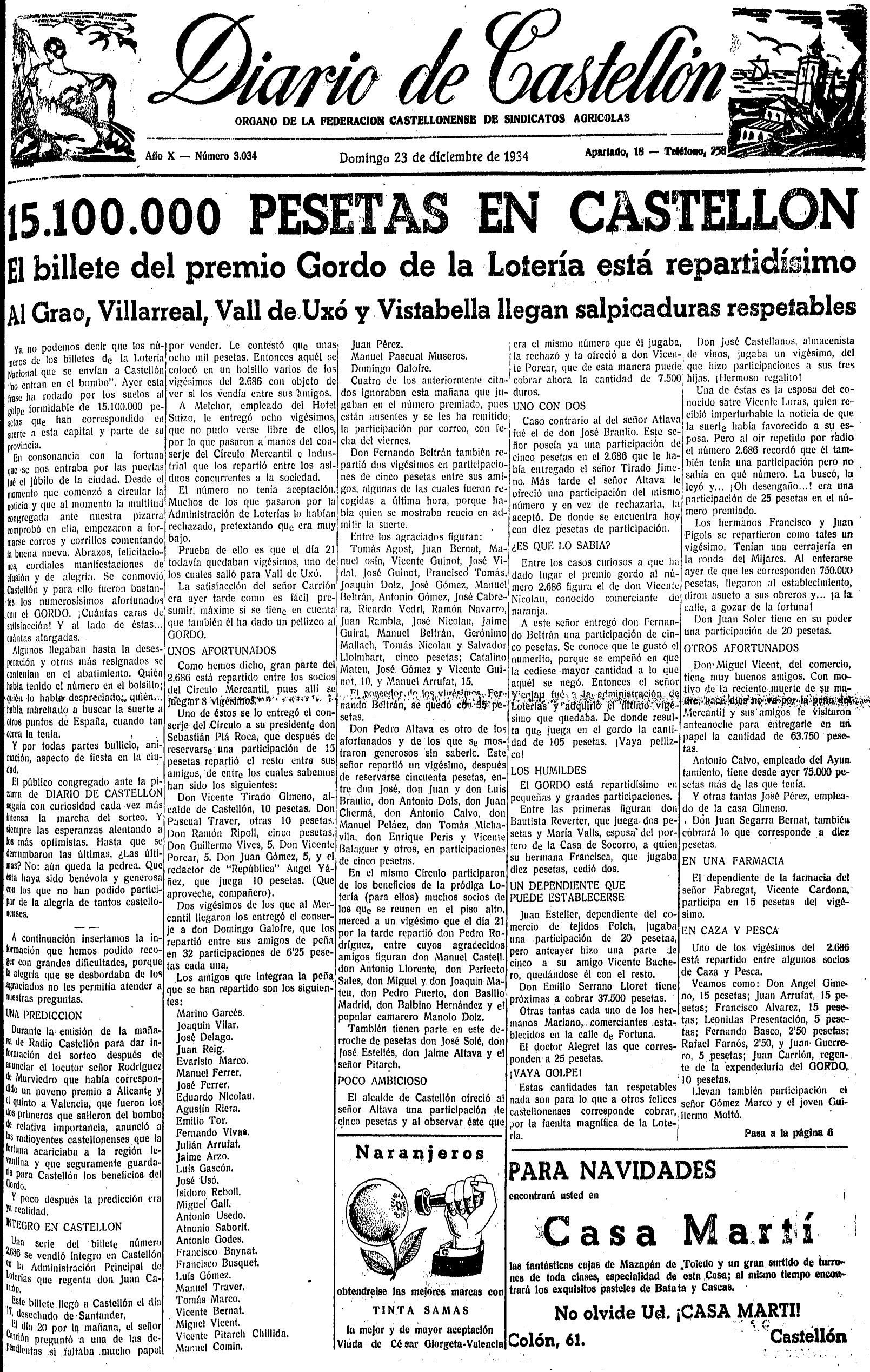 «Repartidísimo» llega en 1934 el popular premio Gordo del Sorteo de Navidad a la provincia de Castellón, según relata Diario de Castellón el domingo 23 de diciembre. Con una pormenorizada crónica de la noticia, se cuentan «salpicaduras respetables» de la suerte en el Grao, Vila-real, la Vall d’Uixó y Vistabella. La suerte sonríe con 15.100.000 pesetas de la época a la provincia, y son incontables las anécdotas de los afortunados del día que se recogen en la prensa. La culpa, del número 2.686, repartido entre Castellón y Santander. Se da la circunstancia de que el regente de la administración de la calle Enmedio -entonces González Chermá-, Juan Carrión González, ha recogido pocas horas antes del sorteo los vigésimos -que no décimos- aún no vendidos de este número, por valor de unas 8.000 pesetas, y ha salido a la busca de clientes.