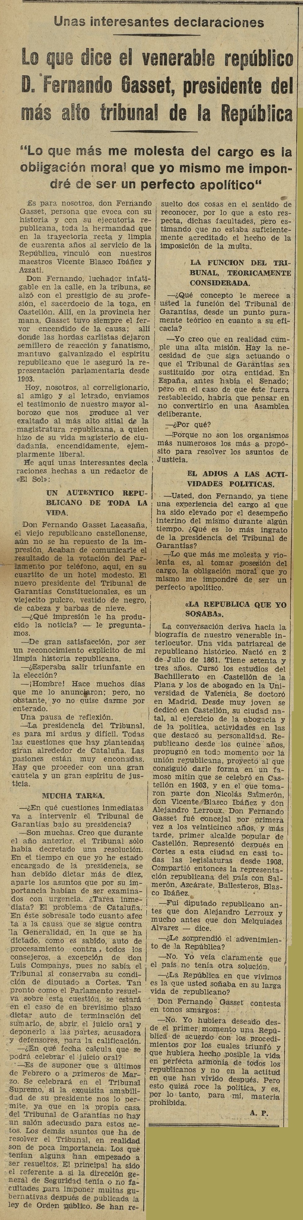Por su parte, el diario valenciano El Pueblo ha publicado dos días antes una interesante entrevista con Gasset, recién conocido su nombramiento. Gasset asume que la tarea de la presidencia del Tribunal es «ardua y difícil» y «todas las cuestiones que hay planteadas giran alrededor de Cataluña. Las pasiones están muy enconadas. Hay que proceder con una gran cautela y un gran espíritu de justicia». El «venerable repúblico» asegura que lo que más le «molesta» del nuevo cargo «es la obligación moral que yo mismo me impondré de ser un perfecto apolítico». Cabe señalar que el Tribunal de Garantías Constitucionales «fue concebido como un sucedáneo de una Segunda Cámara o Senado, con una composición numerosa y compleja, establecida en la propia Constitución» y se le atribuyó «un conjunto de competencias que excedían del ámbito de la jurisdicción constitucional en su actual concepción», como recoge la web del actual Tribunal Constitucional.