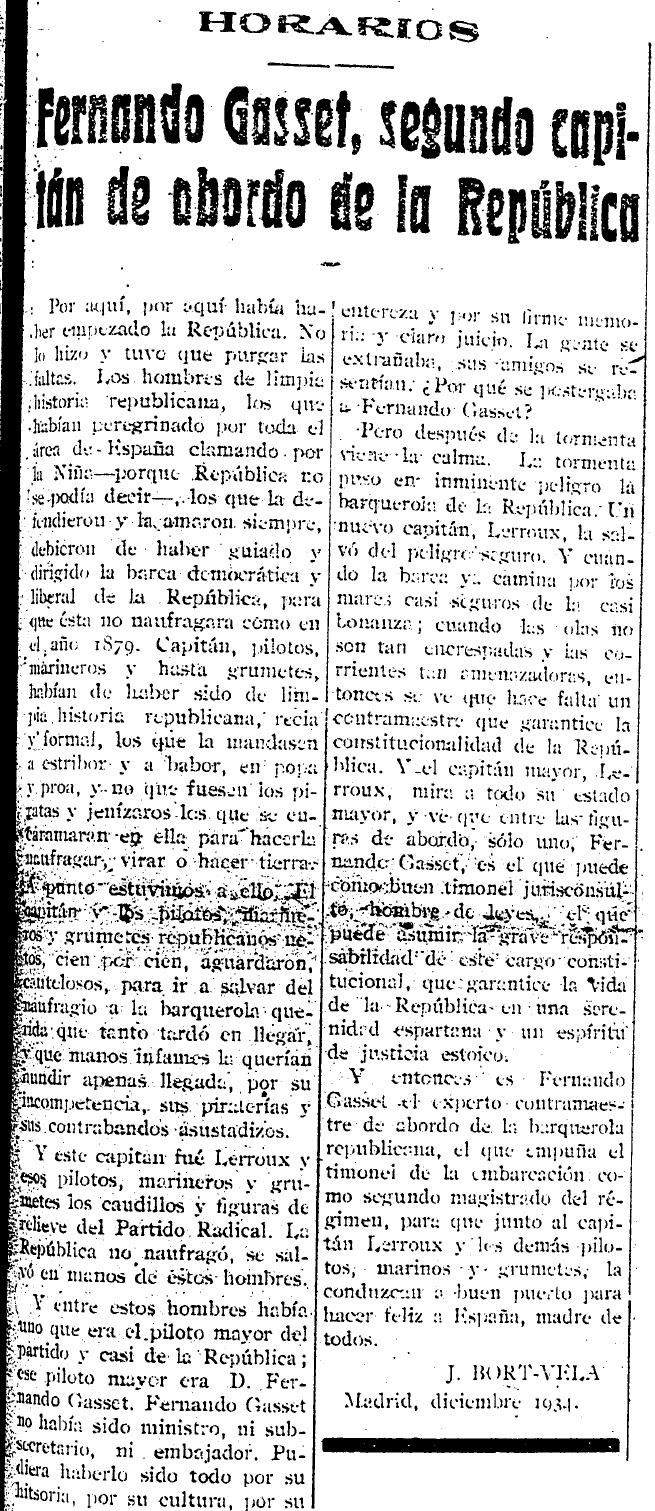 El día de Nochebuena de 1934, el diario castellonense República se felicita en su portada con este artículo del periodista chivertense José Bort-Vela, por el nombramiento del castellonense Fernando Gasset Lacasaña para una de las más altas magistraturas del Estado: la presidencia del Tribunal de Garantías de Constitucionales. Elegido por las Cortes en sesión celebrada el 21 de diciembre, Gasset sustituirá a Álvaro de Albornoz Liminiana, y estará en el cargo hasta su dimisión el 27 de agosto de 1936, cuando pasará a ejercer sus funciones el vicepresidente primero, Pedro Vargas Guerendiain.