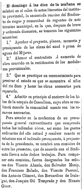 La aprobación del proyecto de la obra del azud del Mijares, que se inauguraría 11 años después, protagoniza una noticia publicada el día de Navidad de 1884 por El Clamor. El Sindicato de Riegos de la capital convoca a los regantes a una junta general para tres días después en el salón de actos del instituto provincial -por entonces ubicado en la actual plaza Santa Clara- «para someter a su aprobación dicho proyecto».