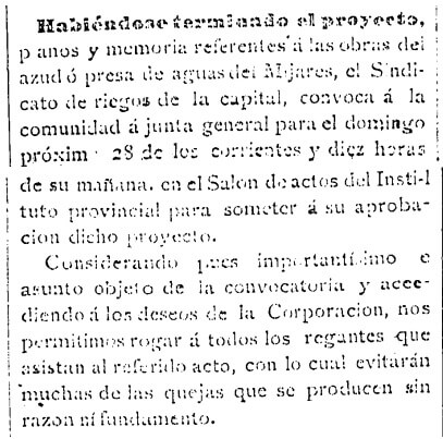 La aprobación del proyecto de la obra del azud del Mijares, que se inauguraría 11 años después, protagoniza una noticia publicada el día de Navidad de 1884 por El Clamor. El Sindicato de Riegos de la capital convoca a los regantes a una junta general para tres días después en el salón de actos del instituto provincial -por entonces ubicado en la actual plaza Santa Clara- «para someter a su aprobación dicho proyecto».