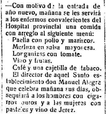 La entrada del Año Nuevo 1925 supone la introducción de un menú extraordinario por parte del Hospital Provincial de Castellón para a los enfermos ingresados en el centro. Heraldo de Castellón recoge su composición, desde la paella con pollo y marisco al postre de vino y frutas, pasando por la merluza en salsa de mayonesa o las longanizas con tomate. El final de la comida resulta, sin embargo, más llamativo: «café y una cajetilla de tabaco».
