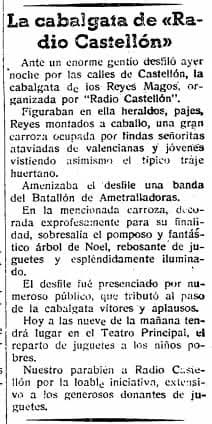 Al día siguiente, domingo, en su crónica de la cabalgata propiamente dicha, Diario de Castellón envía su «parabién» a la emisora local «por la loable iniciativa», así como a «los generosos donantes de juguetes». Un «enorme gentío» asiste al paso de heraldos, pajes, Reyes «montados a caballo» y una «gran carroza ocupada por lindas señoritas ataviadas de valencianas y jóvenes vistiendo asimismo el traje típico huertano», con «la banda del Batallón de Ametralladoras» amenizando el desfile. Llama la atención la mención a un «pomposo y fantástico árbol de Noel, rebosante de juguetes y espléndidamente iluminado».
