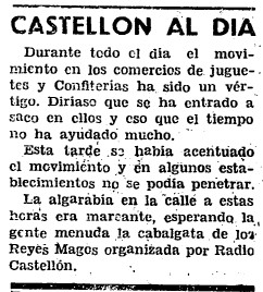 La víspera de la festividad de los Reyes Magos de 1935 es sábado y hace mal tiempo, pero ello no es óbice para que «el movimiento en los comercios de juguetes y confiterías» sea todo «un vértigo», según Heraldo de Castellón: «diríase que se ha entrado a saco en ellos». El diario vespertino subraya la «algarabía» de la tarde en las calles y destaca que «la gente menuda» está esperando en esos momentos «la cabalgata de los Reyes Magos organizada por Radio Castellón«: