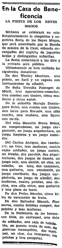 Y es que la atención a los más desfavorecidos es objeto de atención en la fiesta, como muestra también esta otra nota publicada el sábado 5 por Heraldo de Castellón, en la que se da cuenta de «la simpática y sugestiva fiesta» celebrada en la Casa de Beneficencia, con numerosos donativos, los últimos de los cuales se detallan con los nombres de los y las donantes, entre los que se encuentra el Casino Antiguo: