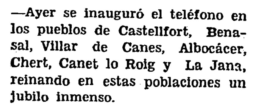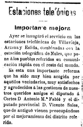 El primer teléfono que llega a Castellón ciudad lo hace en 1886, y el despliegue de la red ocupa las décadas siguientes. Así, La Provincia se hace eco a mediados de 1915 de la inauguración del servicio «en las estaciones telefónicas de Villavieja, Artana y Eslida, combinadas con la estación telegráfica de Nules». El diario subraya que el avance «pone a los pueblos referidos en comunicación rápida con el resto del mundo».