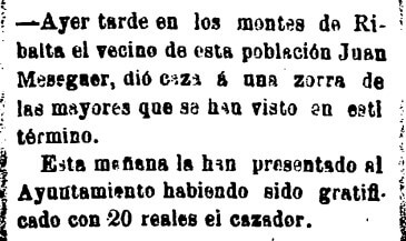 «Una zorra de las mayores que se han visto en este término» es cazada por Juan Meseguer, vecino de Castellón, el domingo 14 de enero de 1900. Según recoge al día siguiente el vespertino El Regional, la captura se lleva a cabo «en los montes de Ribalta» -se entiende que en los alrededores del Tossal de Ribalta– y a la mañana siguiente, al día siguiente el cazador es gratificado por el Ayuntamiento de Castellón «con 20 reales».