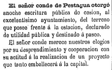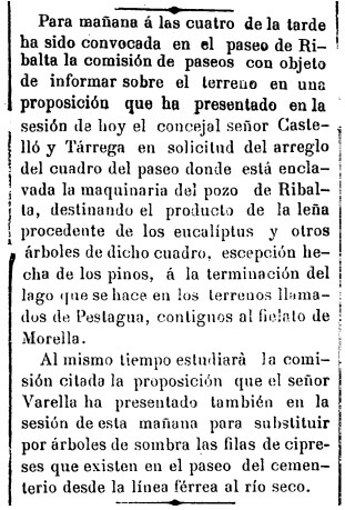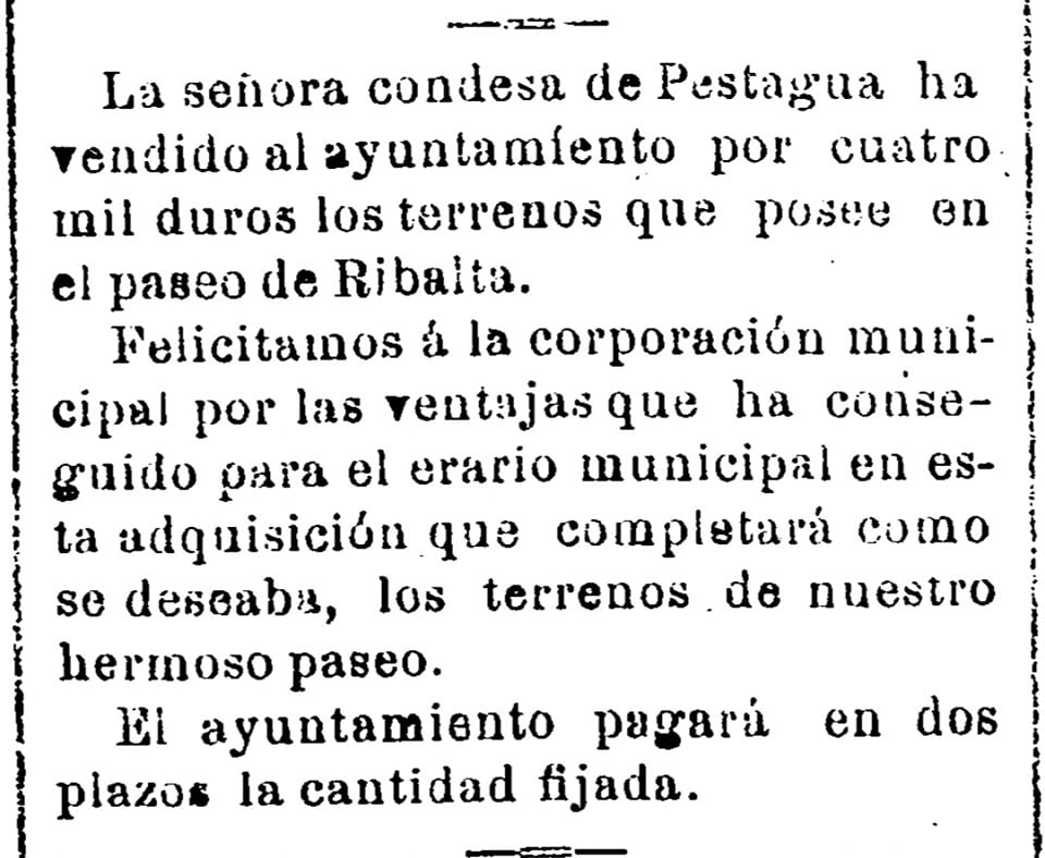 Cabe añadir que un cuarto de siglo atrás, el 5 de septiembre de 1876, Diario de Castellón había recogido la noticia de la «escritura pública de cesión» por parte del conde, Joaquín Rodríguez de Valcárcel y Castillo, de los terrenos situados «frente a la estación» del ferrocarril, que constituirían el Paseo del Obelisco, que a su vez se sumaría al de Ribalta para constituir el parque actual: