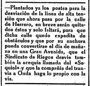 En enero de 1930, Heraldo de Castellón se congratula por «la desviación de la línea de alta tensión que ahora pasa por la calle de Herrero». El periódico confía en que algún día este vial quede libre de obstáculos «y que por su anchura pueda convertirse (…) en una Gran Avenida», pero pone deberes para que ello sea posible: «que el Sindicato de Riegos desvíe también la acequia llamada del Sequiol y que la compañía del tranvía de Onda haga lo propio con la vía» de la popular Panderola. Cabe recordar que el tranvía solo abandonará dicha calle 33 años después, en 1963, con la propia desaparición de este servicio de transporte.