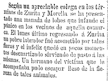 El periódico La Defensa recoge, hacia finales de enero de 1885, la información de «un apreciable colega» sobre la amenaza de «una manada de lobos que infunde el pánico» en los términos municipales de Sorita y Morella. Para explicar su peligrosidad, el diario pone el ejemplo de un «pobre labrador» de la primera localidad que «fue acometido por tales fieras y el infeliz quedó en pocos momentos descuartizado sirviendo de pasto a las mismas».