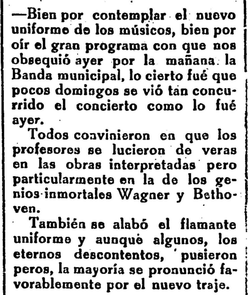 Al inicio del año en que celebra su quinto aniversario, la Banda Municipal de Castellón estrena un nuevo uniforme para sus músicos. Así lo recoge Heraldo de Castellón un lunes de finales de enero de 1930, destacando que bien fuera por «contemplar» el estreno del vestuario o por un «gran programa musical», «pocos domingos se vio tan concurrido el concierto» como en la víspera. «La mayoría se pronunció favorablemente por el nuevo traje», según el reportero, según el cual, el público habría apreciado especialmente la interpretación de piezas «de los genios inmortales Wagner y Beethoven» por parte de la banda dirigida por el maestro Eduardo Felip.
