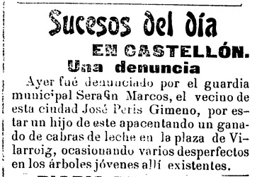Pocos años después de la desaparición de la primera plaza de toros de Castellón, levantada sobre terrenos comprados en 1831 a Nicolás Vilarroig, tras la inauguración del nuevo coso taurino de Pérez Galdós en el verano de 1887, el apellido Vilarroig da nombre a la plaza que ocupa el solar resultante del derribo de la vieja plaza. En enero de 1905, Heraldo de Castellón se hace eco de una denuncia del guardia municipal Serafín Marcos contra el vecino José Peris Gimeno, «por estar un hijo de este apacentando un ganado de cabras de leche en la plaza de Vilarroig, ocasionando varios desperfectos en los árboles jóvenes allí existentes».