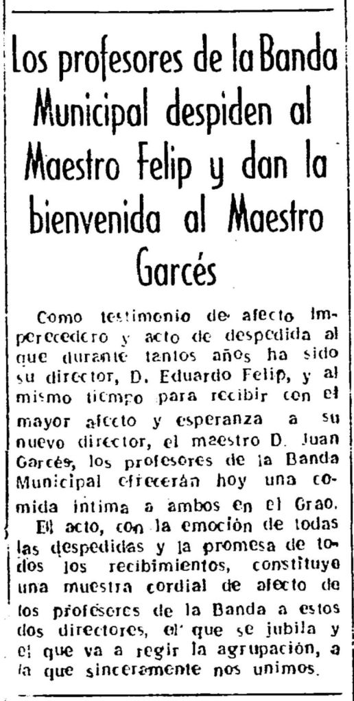 29 años después de haber asumido la dirección de la Banda Municipal de Castellón, un lejano 18 de diciembre de 1925, sustituyendo a Julio Sabater Roig, Eduardo Felip Suárez se jubila a comienzos de 1955. Atrás quedan, entre otros hitos, dos triunfos en el Certamen de Bandas de Valencia, la Guerra Civil y la realización de conciertos en diferentes ciudades españolas. A finales de enero de 1955, Mediterráneo se hace eco del relevo al frente de la banda, que pasa a estar dirigida por Juan Garcés Queralt. Los profesores ofrecen a ambos, Felip y Garcés, «una comida íntima» en el Grao, y el periódico se suma «sinceramente» a la emoción de la despedida al primero y del recibimiento al segundo. Garcés, que ofrecerá su primer concierto el domingo 6 de marzo, pasará a su vez la batuta en 1983 a Francisco Signes Castelló, tras aceptar la dirección de la Banda Municipal de Valencia.