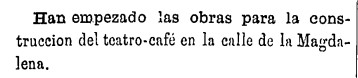 El Clamor de la Democracia incluye un breve suelto en su edición del 5 de febrero de 1885, para dar cuenta del inicio de las obras del nuevo teatro-café de la calle de la Magdalena, hoy Escultor Viciano: