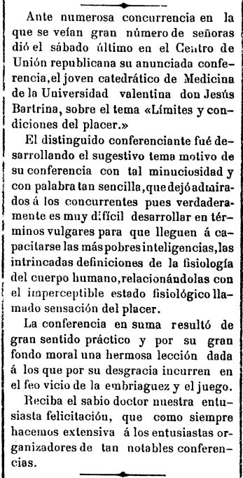 El sábado 4 de febrero de 1905, el Centro de Unión Republicana en Castellón acoge una conferencia del «joven catedrático de Medicina» Jesús Bartrina Capella, valenciano especialista en anatomía y por entonces docente de la Universidad de Sevilla, quien cinco años después regresará a su tierra como catedrático de la Universidad de Valencia. La charla lleva por título Límites y condiciones del placer y reúne a una «numerosa concurrencia», según Heraldo de Castellón, que además destaca que en el público «se veían gran número de señoras».