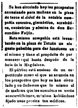 La plaza de Tetuán -antes del Calvario- acoge durante décadas distintos tipos de espectáculos. Donde antes hubo una charca, desecada en tiempos del gobernador Antonio Bermúdez de Castro en la segunda mitad del siglo XX, y más tarde se ubicaría la capilla del Calvario en el camino del antiguo cementerio, en 1900 se instala un circo. Más concretamente, a primeros de febrero se anuncia en Heraldo de Castellón la presencia de «la notable compañía ecuestre, gimnástica, acrobática, excéntrica y cómica de don Secundino Feijóo«. Su debut tiene lugar en la plaza de toros y luego, actúa en «un elegante pabellón» instalado en la plaza de Tetuán.