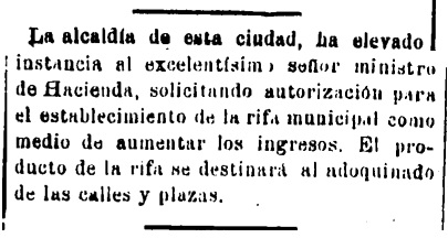 A mediados de febrero de 1895, el alcalde Eliseo Soler Breva solicita al ministro de Hacienda, José Canalejas, una autorización «para el establecimiento de la rifa municipal como medio de aumentar los ingresos», asegurando que el producto de dicha rifa «se destinará al adoquinado de las calles y plazas», según recoge la reseña del Diario de Castellon. El destinatario de la petición del Ayuntamiento de Castellón, no obstante, cesará en su cargo solo cinco semanas después, junto con el resto del gabinete presidido por Práxedes Mateo Sagasta.