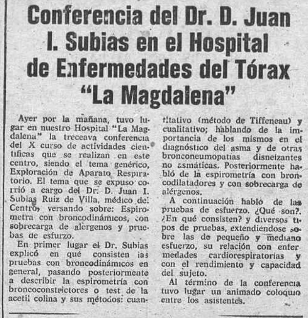 A mediados de febrero de 1975, corresponde al Dr. Juan Ignacio Subías Ruiz de Villa pronunciar la «treceava» (sic) conferencia del décimo curso de actividades científicas. El neumólogo se centra en su intervención en la «espirometría con broncodinámicos, con sobrecarga de alérgenos y pruebas de esfuerzo».
