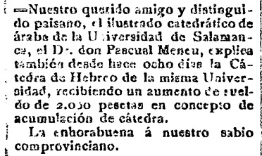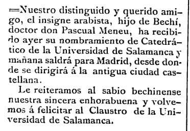 En febrero de 1910 solo ha pasado un año y medio desde que el betxinense Pascual Menéu y Menéu (1857-1934) recibiera el nombramiento como nuevo catedrático de Hebreo en la Universidad de Salamanca (US), y es noticia en la prensa castellonense. Heraldo de Castellón anuncia la obtención de una nueva cátedra por parte del docente, aunque la noticia incluye una errata, puesto que se trata de la Cátedra de Árabe y no de la de Hebreo, que había sido la primera en octubre de 1908. En cualquier caso, se da la enhorabuena al «sabio comprovinciano» por una novedad que comporta «un aumento de sueldo de 2.000 pesetas en concepto de acumulación de cátedra».