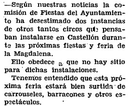 Ante la proximidad de las fiestas y feria de la Magdalena de 1935, que se celebrarán el fin de semana del 23 y 24 de marzo, una comisión del Ayuntamiento de Castellón desestima en el mes de febrero, según información de Heraldo de Castellón, «dos instancias de otros tantos circos que pensaban instalarse en Castellón» durante las celebraciones. El motivo: «que no hay sitio para dichas instalaciones». No obstante, el periódico tranquiliza a su público al asegurar que la próxima feria «estará bien surtida de carrouseles, barracones y otros espectáculos».