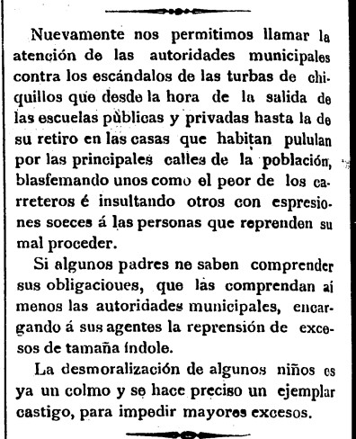 De forma habitual, el lector de prensa de finales del siglo XIX y comienzos del XX se topa en los diarios con denuncias de las actitudes de los niños en la calle, por diferentes motivos. En febrero de 1895, Heraldo de Castellón lamenta «la desmoralización de algunos niños» y alerta a las autoridades municipales «contra los escándalos de las turbas de chiquillos que desde la hora de la salida de las escuelas públicas y privadas hasta la de su retiro en las casas que habitan pululan por las principales calles» de la ciudad. En unos casos, porque blasfeman «como el peor de los carreteros» y en otros porque andan insultando «con espresiones soeces a las personas que reprenden su mal proceder». El diario se duele porque «algunos padres» no sepan «comprender sus obligaciones» y pide «que las comprendan al menos» los concejales del Ayuntamiento que preside Eliseo Soler Breva.