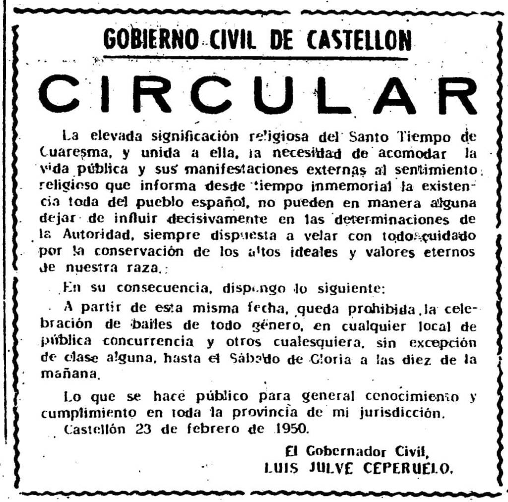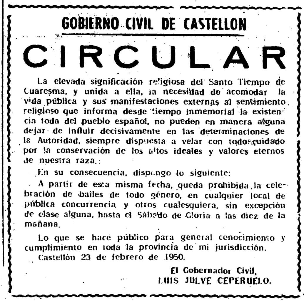 Una semana después del Miércoles de Ceniza de 1950, los lectores de Mediterráneo se encuentran con una circular del Gobierno Civil de Castellón. En ella, el turolense Luis Julve Ceperuelo realiza una larga introducción en la que se apoya en «la elevada significación religiosa del Santo Tiempo de Cuaresma» y «la necesidad de acomodar la vida pública y sus manifestaciones externas al sentimiento religioso que informa desde tiempo inmemorial la existencia toda del pueblo español». Ambos factores influyen «decisivamente en las determinaciones de la autoridad» deseosa de conservar «los altos ideales y valores eternos de nuestra raza».