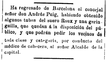 Pocos meses después del éxito de Roux en el centro hospitalario de París, en febrero de 1895, Diario de Castellón anuncia el regreso de Barcelona del concejal de la capital Andrés Puig Gasulla, quien llega con «algunos tubos del suero Roux y una geringuilla, que quedan á la disposición del público y que podrán pedir los vecinos de toda clase y categoría, por conducto del médico de cabecera, al señor Alcalde de la capital», en este caso Eliseo Soler Breva, por más señas médico y cirujano del Hospital Provincial. En el mes de julio, el propio Puig asumirá la vara de mando.