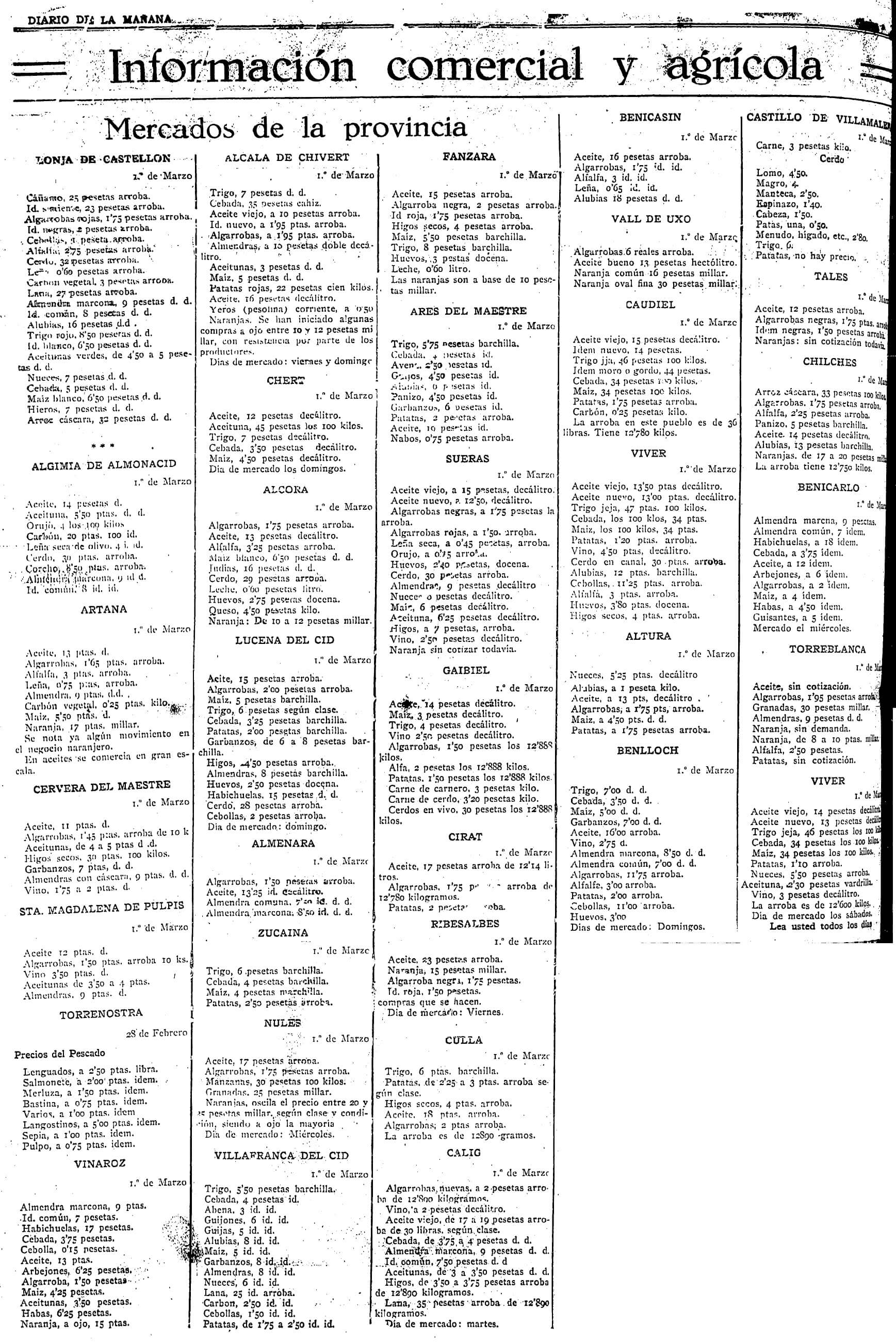 La información económica tiene un peso importante en el castellonense Diario de la Mañana de 1930. Cada día, el periódico publica a toda página los precios de todos los productos agrícolas relacionados al detalle según la situación en cada uno de los mercados de la provincia. Así, el domingo 2 de marzo se recogen los datos desde la Lonja de Castellón a Viver, pasando por Algimia de Almonacid, Artana, Cervera del Maestre, Santa Magdalena de Pulpis, Torrenostra, Vinaròs, Alcalà de Xivert, Xert, l’Alcora, Lucena del Cid, Almenara, Zucaina, Fanzara, Ares del Maestre, Sueras, Gaibiel, Cirat, Ribesalbes, Culla, Càlig, Vinaròs, Benicàssim, la Vall d’Uixó, Caudiel, Altura, Benlloch, Castillo de Villamalefa, Tales, Xilxes, Benicarló o Torreblanca.