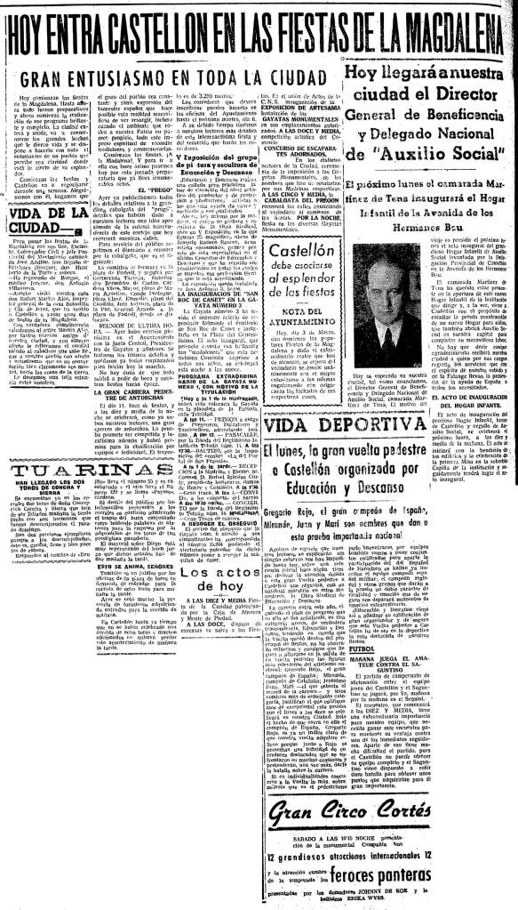 Mediterráneo recoge en esta página, el 3 de marzo de 1945, el «gran entusiasmo» que recorre la ciudad ante las primeras fiestas de la Magdalena de nueve días. Es sábado, y unas horas antes de que el primer Pregó creado por Manuel Segarra Ribés recorra las calles, el Ayuntamiento de Castellón anima a los vecinos a «asociarse al esplendor de las fiestas» engalanando sus balcones. Asimismo, se dan detalles sobre la actividad de las gayatas y sobre la «gran carrera pedestre de antorchas» prevista como colofón de los festejos. En el plano deportivo, se destaca la participación del campeon burgalés Gregorio Rojo en la «gran vuelta pedestre» programada para el lunes 5.