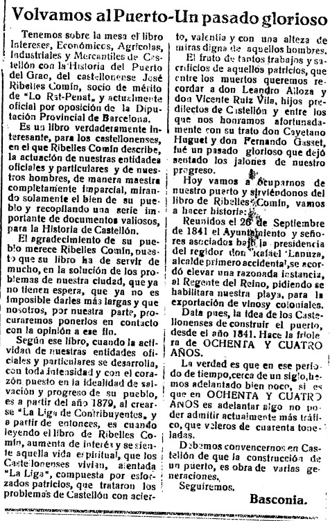 Basconia se lamenta en el artículo de que en los 84 años transcurridos desde ese momento «hemos adelantado bien poco» puesto que en 1925 apenas puede admitir el puerto «más tráfico que veleros de cuarenta toneladas». Por ello, concluye: «debemos convencernos en Castellón de que la construcción de un puerto es obra de varias generaciones».