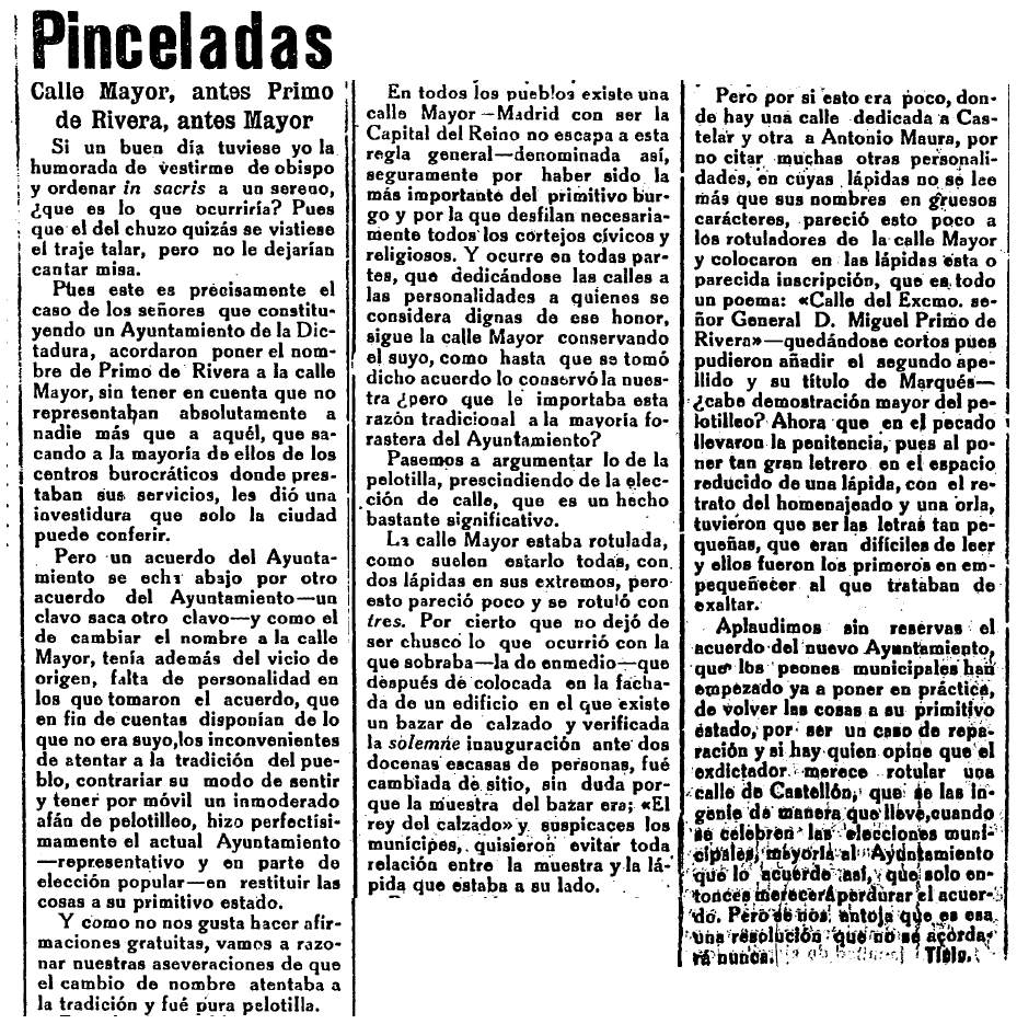 En su artículo de Heraldo de Castellón, el columnista se alegra de que el nuevo consistorio devuelva a la calle Mayor su nombre original, sustituido por la corporación anterior por el del dictador: «un clavo saca otro clavo» y arremete contra la «falta de personalidad de los que tomaron el acuerdo, que a fin de cuentas disponían de lo que no era suyo» y lamenta que atentasen contra «la tradición del pueblo», contrariando «su modo de sentir», con el agravante de «tener por móvil un inmoderado afán de pelotilleo«. La prueba definitiva de esa intención aduladora la encuentra Ticio en que «la calle Mayor estaba rotulada, como suelen estarlo todas, con dos lápidas en sus extremos, pero esto pareció poco y se rotuló con tres», con la tercera situada en mitad de la calle. Esta última, por cierto, sería «cambiada dde sitio» tras colocarse inicialmente en la fachada de un edificio «en el que existe un bazar de calzado», «sin duda porque la muestra del bazar era El rey del calzado y suspicaces los munícipes, quisieron evitar toda relación entre la muestra y la lápida que estaba a su lado». La decisión de rotular la calle con el nombre de Primo de Rivera se tomó el 3 de diciembre de 1926, siendo alcalde Salvador Guinot Vilar.