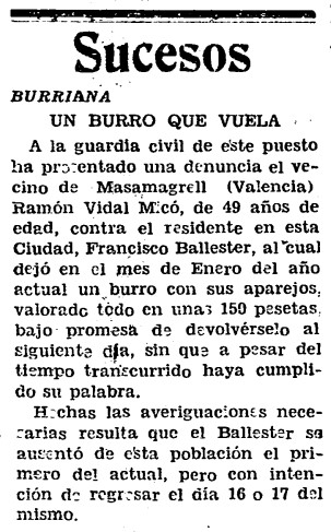 El humor es un recurso habitual en las crónicas de sucesos de los periódicos en los años 30. Así, en marzo de 1935, Heraldo de Castellón refiere el robo de un burro en la localidad de Burriana bajo el titular Un burro que vuela. Según el diario, un vecino de Massamagrell ha denunciado a un burrianense tras haberle prestado dos meses antes «un burro con sus aparejos, valorado todo en unas 150 pesetas, bajo promesa de devolvérselo al siguiente día, sin que a pesar del tiempo transcurrido haya cumplido su palabra». El 1 de marzo, el presunto autor del robo se habría ausentado «con intención de regresar el día 16 o 17» de marzo.