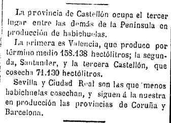 A mediados de marzo de 1895, El Clamor de Castellón publica una curiosa clasificación sobre la producción de habichuelas, producto en el que la provincia ocupa «el tercer lugar entre las demás de la Península», solo por detrás de Valencia y la provincia de Santander, que en 1982 pasará a convertirse en la comunidad autónoma de Cantabria. A Castellón, que produce «71.130 hectólitros» (sic), le siguen La Coruña y Barcelona.