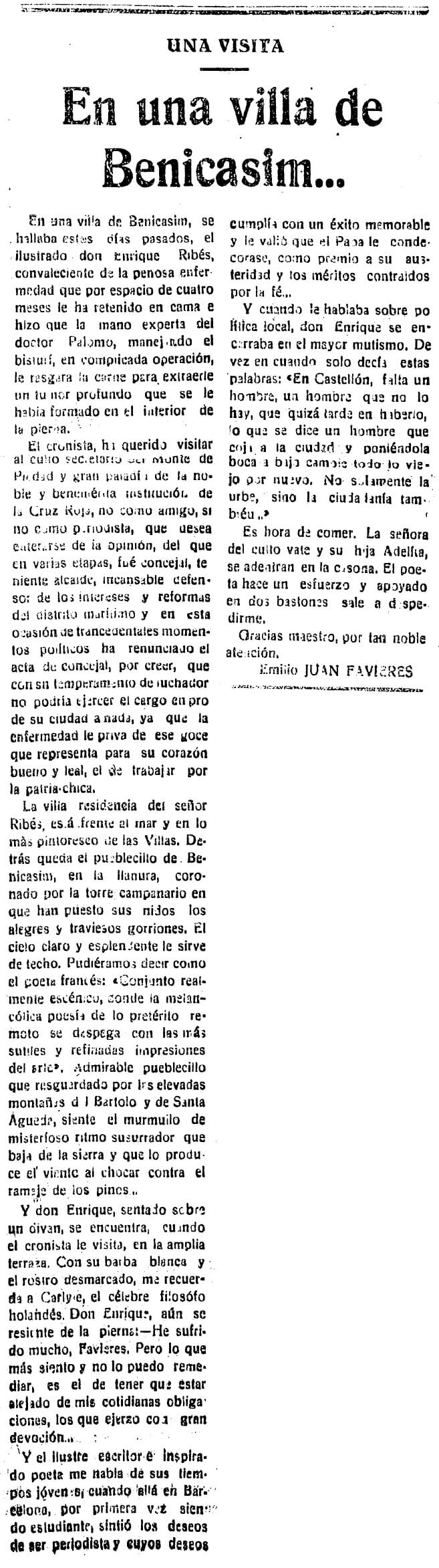 Doctor en Farmacia, escritor y poeta laureado, arqueólogo y crítico de arte, Enrique Ribés Sangüesa (1868-1936) es un castellonense polifacético, a caballo entre los siglos XIX y XX, que entre sus actividades incluye también el periodismo y la política. Presidente de la Asamblea Local de la Cruz Roja, es concejal del Ayuntamiento de Castellón de 1917 a 1927. En marzo de 1930, convaleciente de una intervención quirúrgica realizada por el doctor Palomo, recibe en las villas de Benicàssim a su amigo Emilio Juan Favieres, del diario La Provincia Nueva.