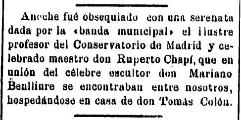 Tres días después de la Romeria a la Magdalena de 1895, Diario de Castellón se hace eco de la presencia en Castellón del «ilustre profesor del Conservatorio de Madrid y celebrado maestro don Ruperto Chapí«, así como del «célebre escultor don Mariano Benlliure«. El compositor de Villena y el artista valenciano se hospedan en casa de «don Tomás Colón«, abuelo del escultor Tomás Colón Bauzano según confirma la propia familia. Los dos visitantes, referentes artísticos a nivel nacional, son agasajados con una serenata de una banda municipal, según reseña el periódico, seguramente refiriéndose a la del Parque de Bomberos o a La Lira, dado que la Banda Municipal de Castellón no será constituida hasta 30 años más tarde, en 1925.
