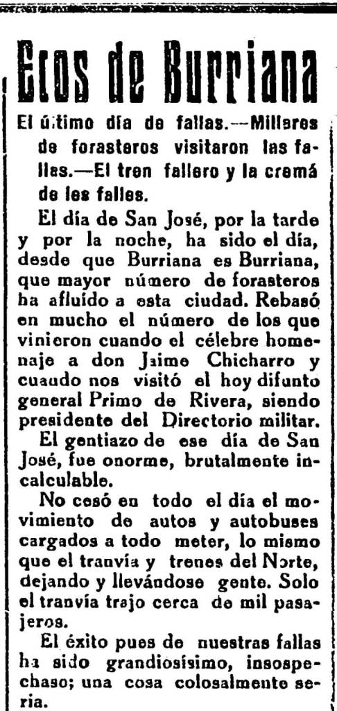 Dos años después de la cremà de la «primera falla artística plantada en Burriana», en concreto en la plaza de la Mercè, la fiesta va tomando vuelo. No en vano en 1929 ya son tres los monumentos que se plantan. En 1930, el corresponsal de Heraldo de Castellón subraya que «con esto de las fallas hemos atraído a nuestra ciudad a miles y miles de forasteros», por lo que se pregunta: «¿conviene que cuidemos, conservemos y fomentemos esta fiesta de las fallas?», pidiendo al Ayuntamiento que se pronuncie al respecto.