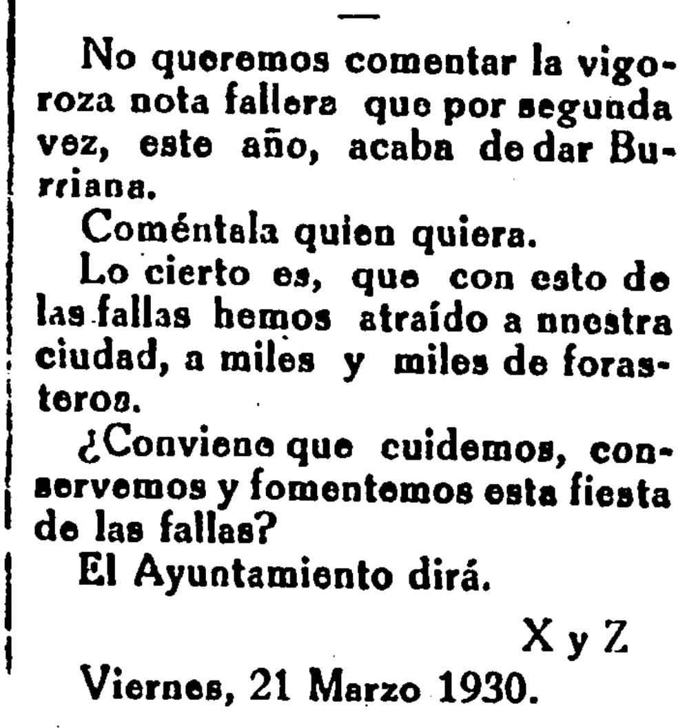 Dos años después de la cremà de la «primera falla artística plantada en Burriana», en concreto en la plaza de la Mercè, la fiesta va tomando vuelo. No en vano en 1929 ya son tres los monumentos que se plantan. En 1930, el corresponsal de Heraldo de Castellón subraya que «con esto de las fallas hemos atraído a nuestra ciudad a miles y miles de forasteros», por lo que se pregunta: «¿conviene que cuidemos, conservemos y fomentemos esta fiesta de las fallas?», pidiendo al Ayuntamiento que se pronuncie al respecto.