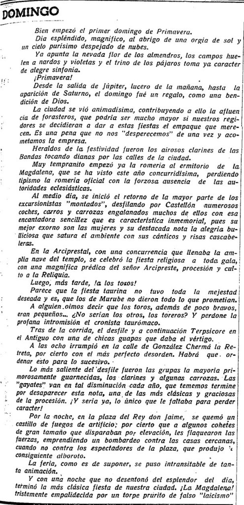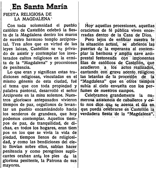 Según explica el periódico en páginas interiores, el sermón desarrollado por el arcipreste se refiere precisamente a «lo que eran y significan estas tradiciones religiosas, vinculadas en el mismo génesis de esta ciudad», criticando que «hoy aquellas procesiones, aquellas oraciones de fe pública viven encerradas dentro de la Casa de Dios», al tiempo que se celebra «la esperanza al contemplar la hermosa y amplia nave arciprestal festoneada con imponentes filas de católicos de Castellón».