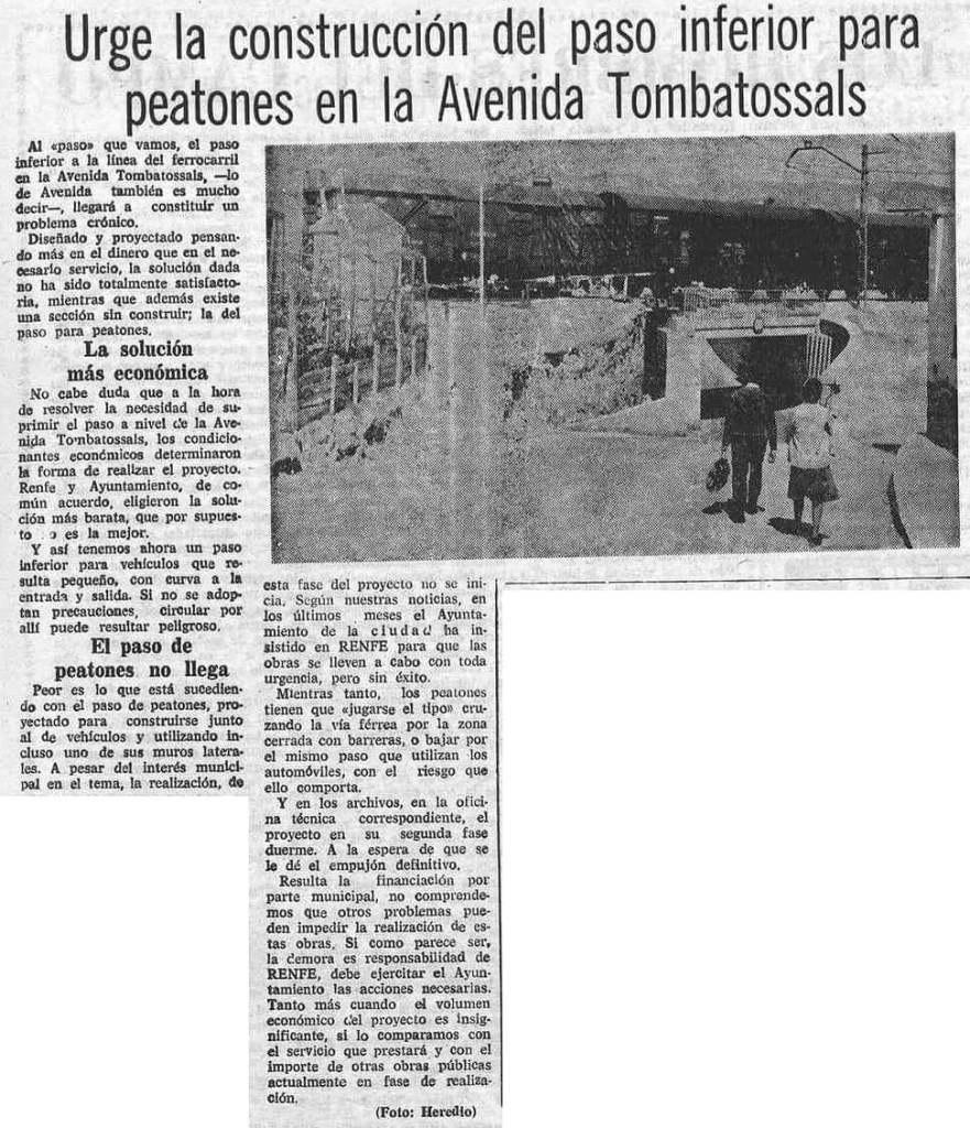 Dos años más tarde, el 3 de abril de 1977, el periódico denuncia que la obra del paso subterráneo entre la calle Segorbe y la avenida Tombatossals se ha ejecutado «pensando más en el dinero que en el necesaerio servicio» al elegirse «la solución más barata»: «un paso inferior para vehículos que resulta pequeño, con curva a la entrada y salida». Asimismo, se reclama la construcción del paso inferior para peatones, proyectado pero no ejecutado.