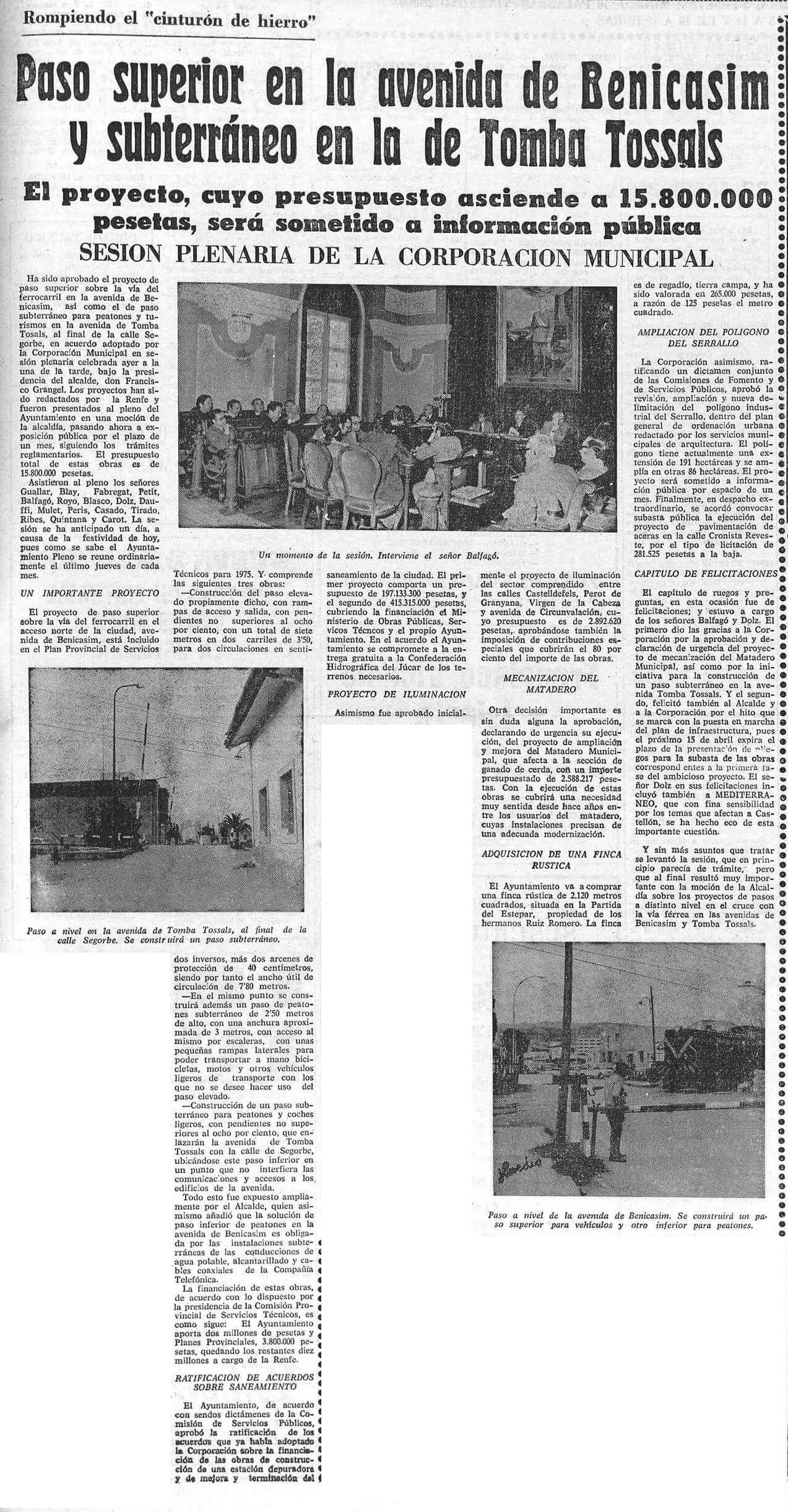 El proyecto de construcción de un paso superior sobre las vías del ferrocarril en la avenida de Benicàssim y otro subterráneo en la avenida Tombatossals protagonizan la noticia sobre el pleno municipal del mes de marzo de 1975 en Mediterráneo. Con un presupuesto de 15,8 millones de pesetas, el periódico celebra en su antetítulo que las nuevas infraestructuras tendrán un importante papel «rompiendo el cinturón de hierro» de la ciudad, un cuarto de siglo antes de la inauguración del soterramiento de la vía férrea y de la nueva estación del ferrocarril. Por cierto, que la noticia es del mismo día en que el periódico anuncia que la hasta entonces conocida como «plaza de enlace» entre la calle Colón y la avenida del Mar iba a llamarse plaza Cardona Vives, por decisión del consistorio presidido por Francisco Grangel Mascarós.