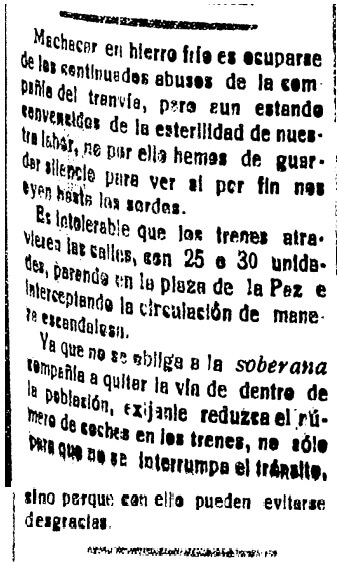 En términos amargos, protesta a comienzos de abril de 1915 El Clamor contra «la compañía del tranvía» (la Panderola), pues considera que ocuparse de sus «continuados abusos» equivale a «machacar en hierro frío». Pero concluye que «no por ello hemos de guardar silencio», de manera que denuncia como «intolerable que los trenes atraviesen las calles, con 25 o 30 unidades, parando en la plaza de la Paz e interceptando la circulación de manera escandalosa». Así, insta a las autoridades a que dado que «no se obliga a la soberana compañía a quitar la vía de dentro de la población», al menos se le exija que reduzca el número de coches (vagones) para no interrumpir el tráfico y evitar desgracias.