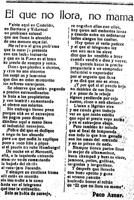 Me refiero al gran problema / que la naranja presenta / con esa lucha incruenta / y que en la Plana es el tema / su precio de compra y venta. Así presenta en Heraldo de Castellón Paco Aznar esta composición poética sin desperdicio, de título llamativo y referida a uno de los temas de actualidad en abril de 1925, como es el contraste entre la realidad del mercado citrícola y las quejas del empresariado al respecto: Si queréis hacer la prueba / preguntarle a un comprador / industrial o exportador / por el negocio que lleva / y os dirá que eso es atroz.