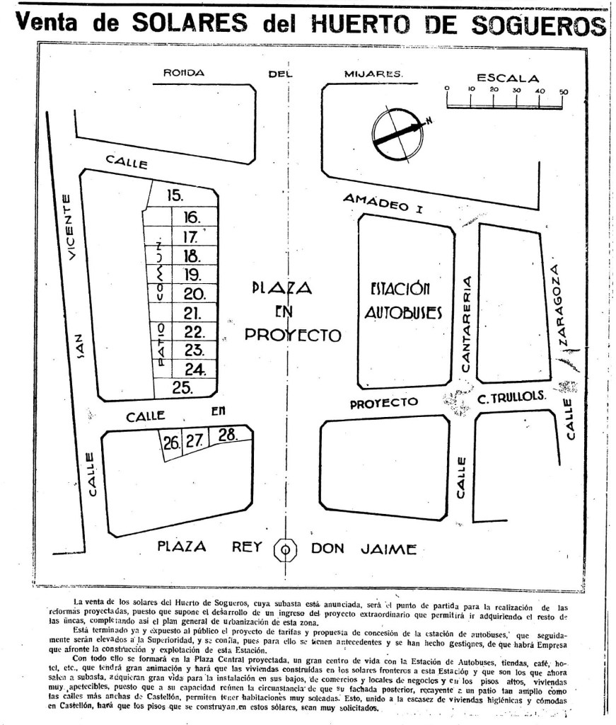 Tras años de parálisis del proyecto, tras la Guerra Civil asume la alcaldía el propio Traver, quien el 1 de julio de 1939 anuncia que el consistorio ya es el propietario de los terrenos, agradeciendo el «desinterés» de los sogueros, a quienes a cambio se les da un solar junto al matadero municipal en el actual polígono Rafalafena. El alcalde habla del proyecto de establecer la estación de autobuses en la futura plaza, y entre los planes municipales llegará a estar la idea de situar allí también el Banco de España y hasta un hotel, proyectos que no llegarán a fraguar. No obstante, en abril de 1940, Mediterráneo publica este plano-anuncio de la venta de solares: