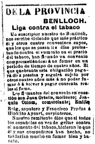 En abril de 1900, «un suscriptor» de Heraldo de Castellón en Benlloc escribe al periódico para presumir de su pragmatismo, junto con «otros cuatro convecinos suyos». El lector se lamenta por la actitud de «los que se pasan los días protestando contra el aumento en el precio del tabaco» y explica que junto con sus cuatro amigos «han firmado un convenio comprometiéndose a no fumar en un periodo de tiempo de cuatro años», nada menos, estableciendo incluso un sistema de castigos para los incumplidores del acuerdo. Los firmantes son el molinero Juan Ortells, el comerciante Joaquín Colom, el zapatero Emilio Roig y los carpinteros Francisco Pradas e Hipólito Aycart.