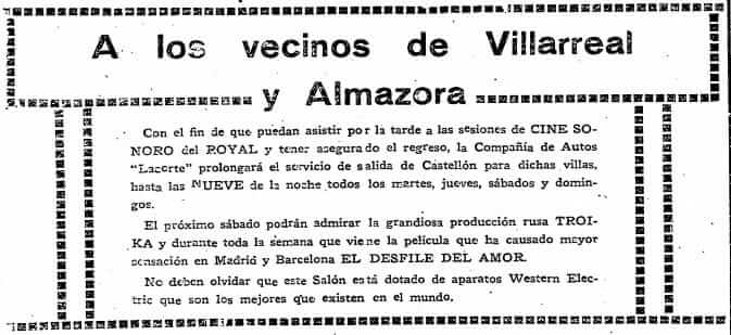 El éxito del sonido en la gran pantalla, no obstante, es fulgurante. El 9 de enero de 1931, el propio Diario de la Mañana publica este anuncio, en el que se da cuenta de la adaptación de los horarios del autobús de la compañía Lacorte para que los vecinos de Vila-real y Almassora «puedan asistir por la tarde a las sesiones de cine sonoro del Royal y tener asegurado el regreso».