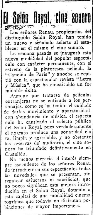 Tres años después de que Nueva York acogiera la primera proyección comercial de películas con sonidos completamente sincronizados, en abril de 1927, Diario de la Mañana anuncia el estreno del «cine sonoro» en Castellón, gracias a «los señores Renau, propietarios del distinguido Salón Royal», inaugurado en 1920 por Vicente Renau Torrent en la calle Enmedio. El periódico celebra que esta «nueva modalidad» se instale «con carácter permanente» e informa a sus lectores de que la primera película con sonido vista en la capital de la Plana ha sido la «pintoresca» La canción de París. Solo hay un pero: «por tratarse de películas extranjeras no se entiende a los personajes». En la década de los 30 irán apareciendo los primeros estudios de doblaje en Madrid.
