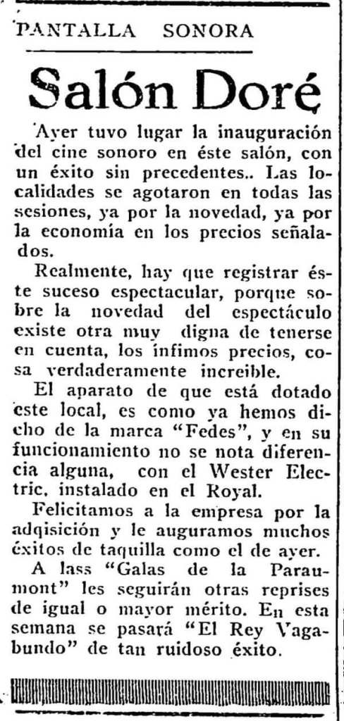 Poco más tarde, la novedad del cine sonoro se hará extensiva al Salón Doré, en la plaza de la Paz, como informa Heraldo de Castellón el 23 de marzo de 1931. Lo hará con otro «éxito sin precedentes»: las localidades se agotan «ya por la novedad, ya por la economía en los precios señalados».