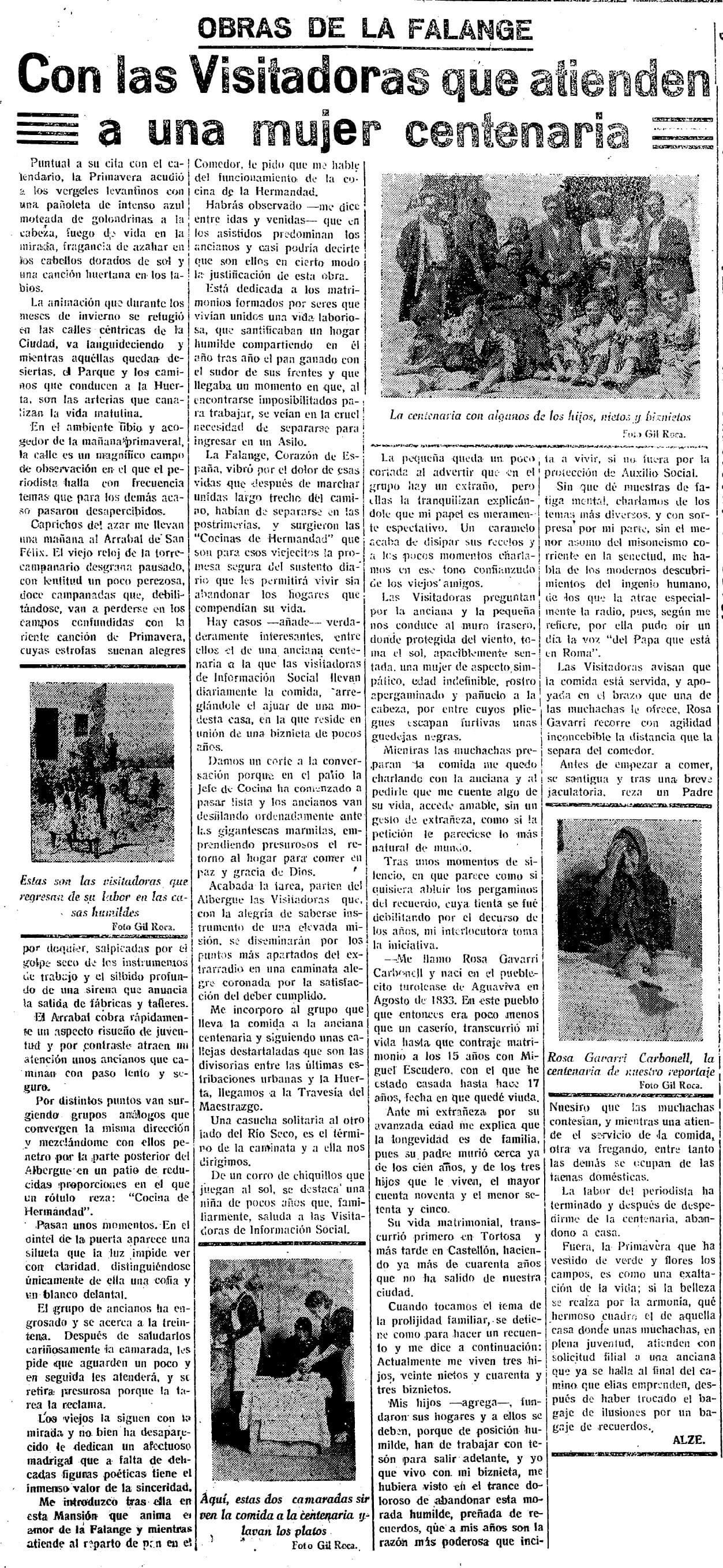 A sus 106 años, Rosa Gavarri Carbonell protagoniza este extenso reportaje que firma Alze en la primavera de 1940 en Mediterráneo. Al año de acabar la Guerra Civil, el periódico se hace eco del trabajo de las «visitadoras» de Información Social de la Falange que ayudan a la anciana mujer con el «ajuar» y demás tareass de su casa, en la que vive con una bisnieta de corta edad. Rosa se dice turolense de Aguaviva, nacida en 1833, con tres hijos vivos, 20 nietos y 43 bisnietos… y aún atenta a avances técnicos como la radio, a la que agradece haberle permitido escuchar un día «al Papa que está en Roma».